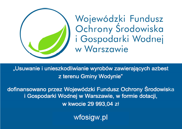 „Usuwanie i unieszkodliwianie wyrobów zawierających azbest z terenu Gminy Wodynie” dofinansowano przez Wojewódzki Fundusz Ochrony Środowiska i Gospodarki Wodnej w Warszawie w formie dotacji w kwocie 29 993,04 zł.