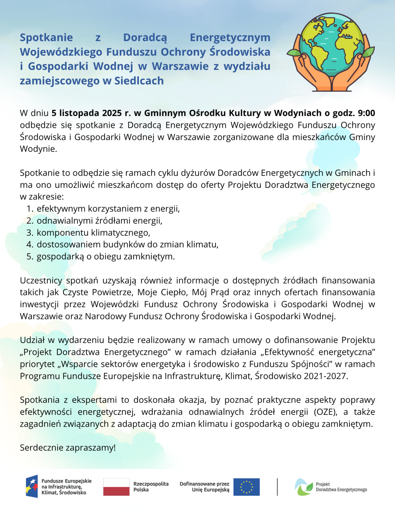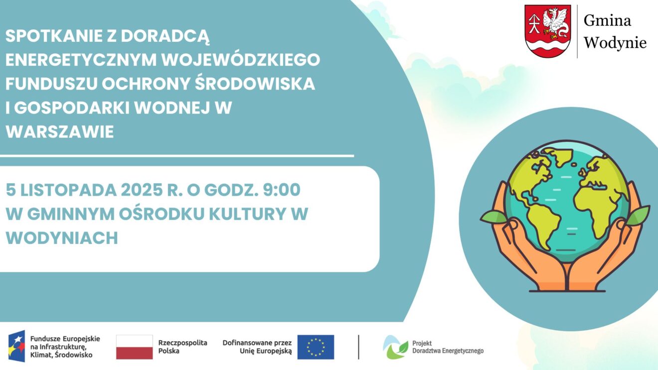 W dniu 5 listopada 2025 r. w Gminnym Ośrodku Kultury w Wodyniach o godz. 9:00 odbędzie się spotkanie z Doradcą Energetycznym Wojewódzkiego Funduszu Ochrony Środowiska