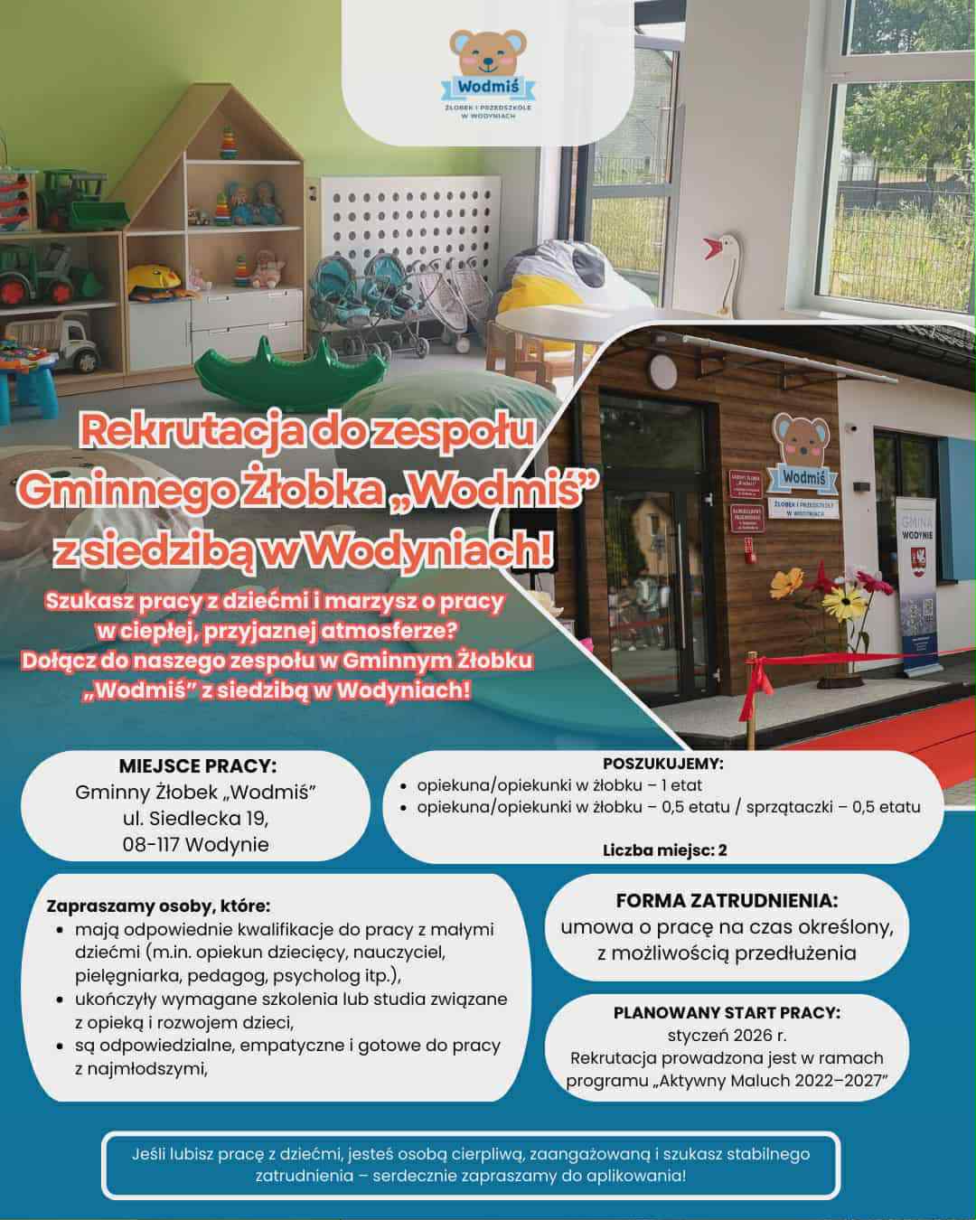 Wójt Gminy Wodynie Wojciech Klepacki serdecznie zaprasza wszystkie zainteresowane osoby do zapoznania się z ogłoszeniem o naborze na wolne stanowiska pracy w Gminnym Żłobku „Wodmiś” z siedzibą w Wodyniach.