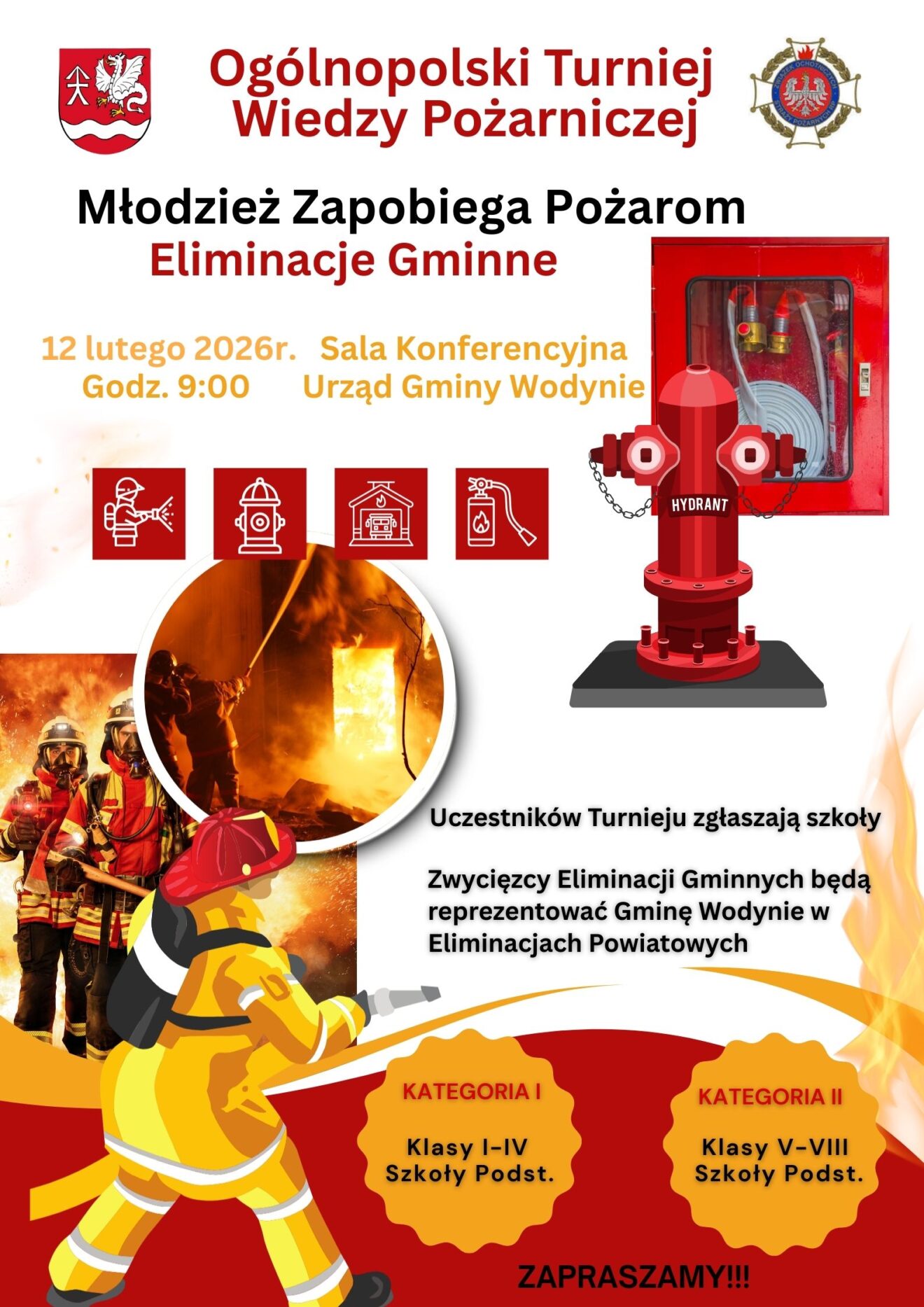 Wójt Gminy Wodynie oraz Zarząd Oddziału Gminnego Związku Ochotniczych Straży Pożarnych RP w Wodyniach serdecznie zapraszają dzieci i młodzież uczęszczającą do szkół na terenie Gminy Wodynie do udziału w Ogólnopolskim Turnieju Wiedzy Pożarniczej „Młodzież Zapobiega Pożarom”.