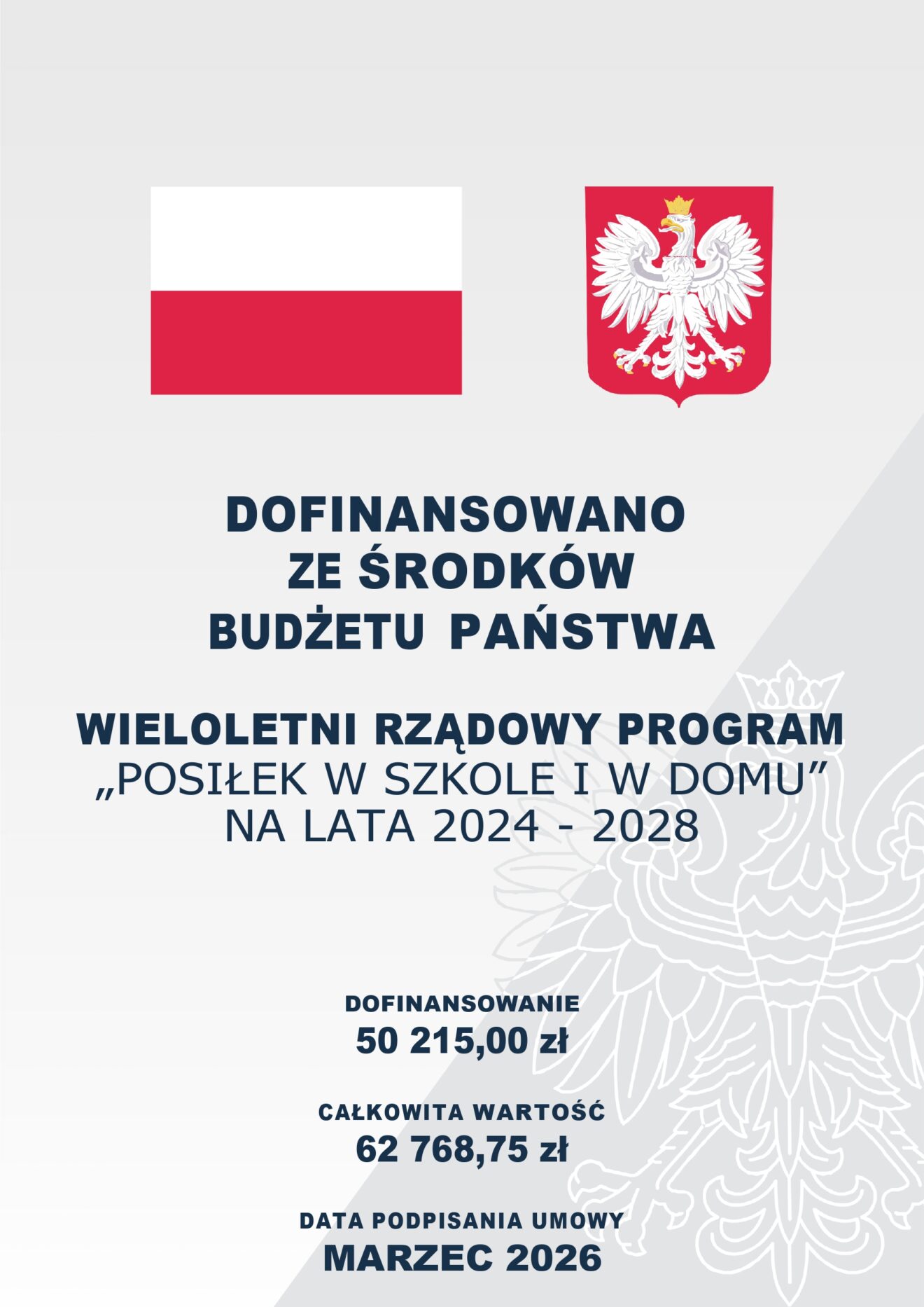 Gmina Wodynie otrzymała wsparcie finansowe w formie dotacji celowej w 2026 roku na dofinansowanie zadania własnego realizowanego w ramach wieloletniego rządowego programu „Posiłek w szkole i w domu” na lata 2024-2028 w ramach Modułu 1- Dla Dzieci i Młodzieży oraz Modułu 2 – Dla Osób Dorosłych, z przeznaczeniem na dofinansowanie wsparcia w formie: posiłku, świadczenia pieniężnego na zakup posiłku lub żywności, świadczenia rzeczowego w postaci produktów żywnościowych.